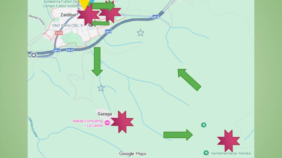 Zaldibarko dorretxetik, olazar kaletik eskumara biratu aurrera jarraitu gaztetxera heldu arte. Gaztetxetik, zubi aspitik pasatu aurrera jarraitu menditik auzora heldu arte. Hirugarren izar morea aurkitu arte.