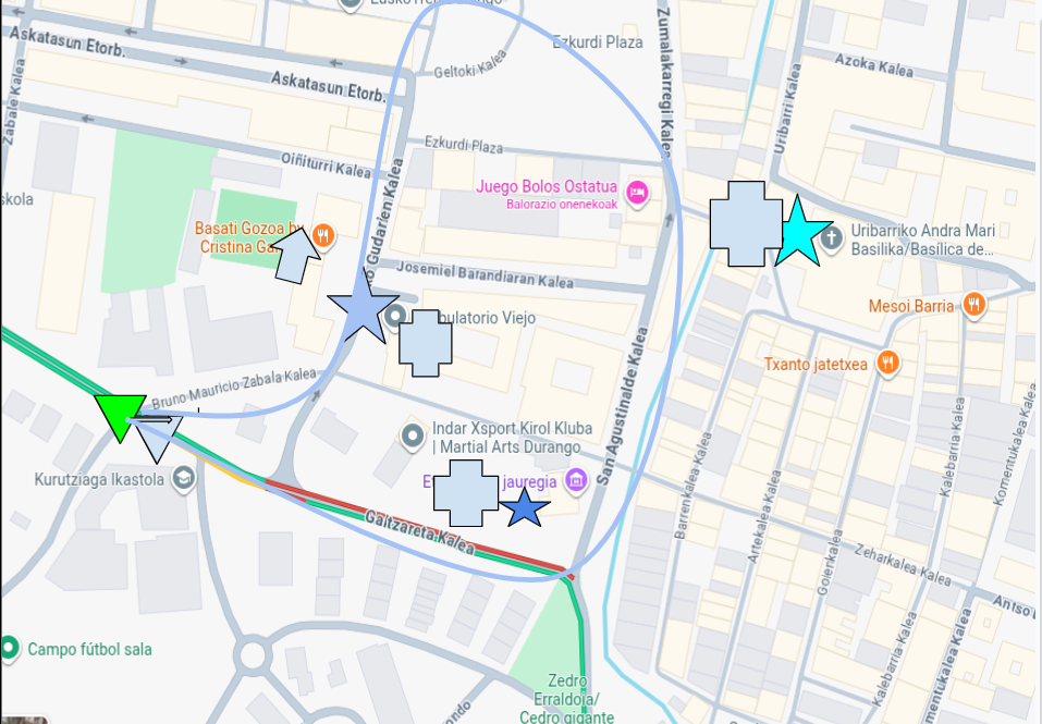 Biratu eskuinera eta Galtzareta kalean sartu, dena aurrera egin Kurutziaga Ikastolan agertu arte eta dena amaitu duzu.